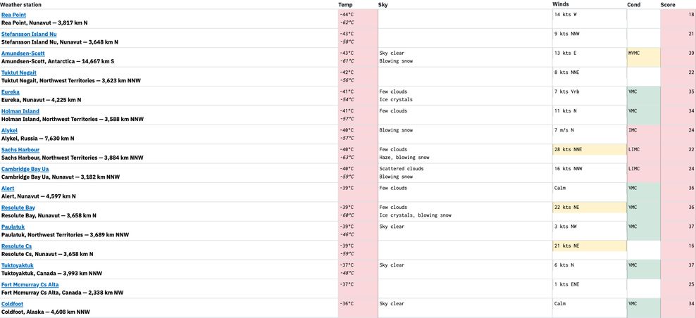 Areas in Nunavut are really feeling the cold this morning, with Rea Point leading the pack at a very bitter -44°C, with a -62°C wind chill. Stafansson Island came in second place on the list at -43°C, while Amundsen-Scott in Antarctica sat at -43°C in third place.