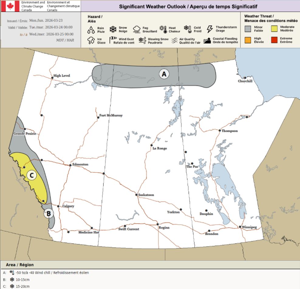Looking at the ECCC Significant Weather Outlook, other portions of Alberta are at risk of seeing some more snow starting on Tuesday, March 24.