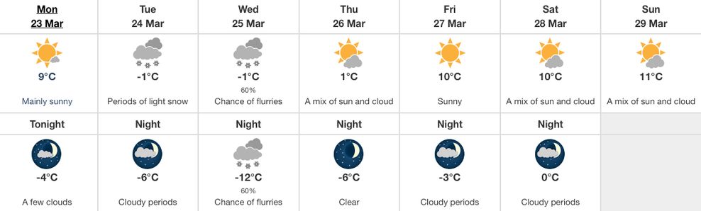 The seven-day forecast for Calgary is a tad better than for Edmonton, with light snow not showing up until tomorrow, and Wednesday, March 25, being under a 60 per cent chance of flurries during the day and night.