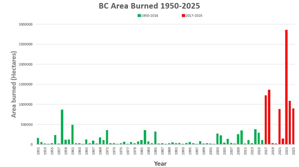 Flannigan warned that these fire surges are “our new reality.” From 2017 to 2025, more land area burned than from 1950 to 2016.