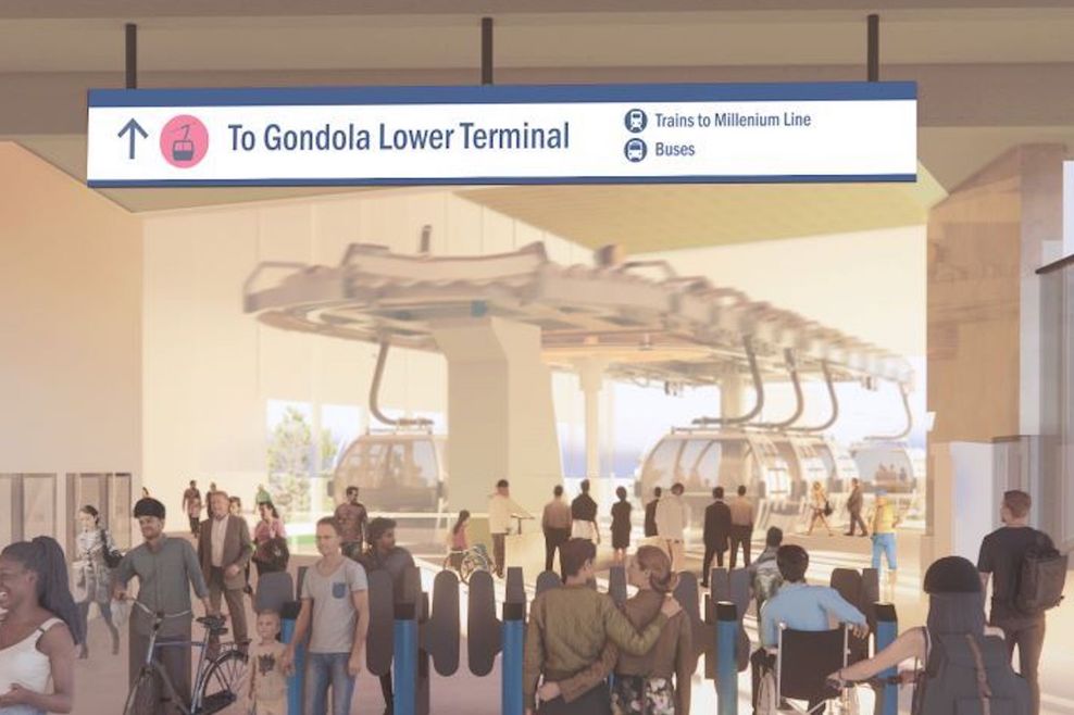 Artistic rendering of the SFU Burnaby gondola lower terminal building next to SkyTrain Production Way-University Station. (TransLink)