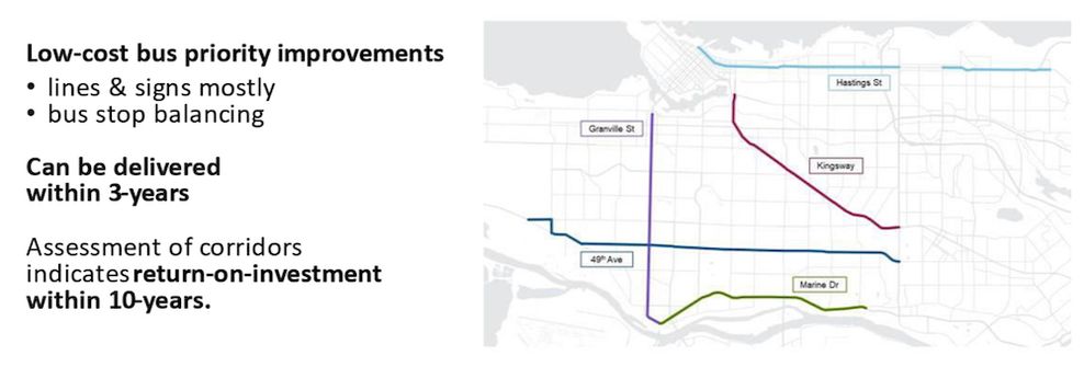 In October 2023, Vancouver City Council voted unanimously in favour of a member motion by city councillor Sarah Kirby-Yung to add bus priority measures on major bus corridors in the city, including Hastings Street, Kingsway, 49th Avenue, and Granville Street. The goal was to improve travel times by at least 10 per cent by 2026. This motion passed over 800 days ago.